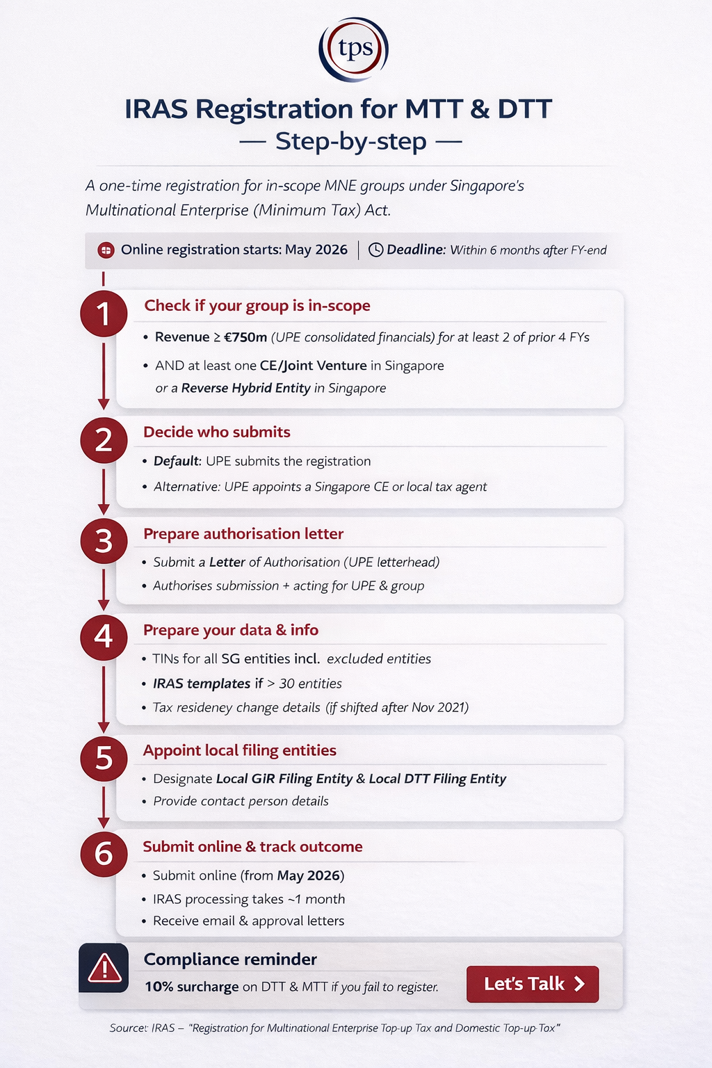 This one-time registration applies to MNE groups with annual consolidated revenue of €750 million or more and entities based in Singapore. The registration must be completed within six months of the group's first financial year subject to the Act. Early preparation is key to meeting these new compliance requirements and avoiding penalties.